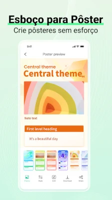 A inteligência artificial de EdrawMind AI vai além da simples visualização. Com o Resumo de IA, analise e condense automaticamente conteúdos complexos de documentos como PPT, Word, PDF, HTML, TXT e Markdown, gerando mapas mentais detalhados a partir de suas informações. Leve suas criações um passo adiante com a funcionalidade "AI Mind Map to Poster", transformando instantaneamente o esboço do seu mapa mental em pôsteres visualmente deslumbrantes, com temas personalizáveis que variam do corporativo ao moderno, do minimalista à moda. E para complementar, o Desenho de IA permite criar gráficos incríveis, convertendo texto em imagens e imagens em obras de arte em segundos, expandindo suas possibilidades criativas.