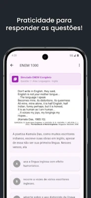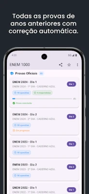 Desvende o universo do ENEM praticando com uma vasta biblioteca de questões autênticas, extraídas de edições anteriores do exame. **Enem 1000** organiza este conteúdo valioso por ano e por todas as áreas do conhecimento exigidas, permitindo que você personalize seu treino e solidifique sua base. Experimente a agilidade de uma correção imediata e automática, que fornece feedback instantâneo sobre seu desempenho. Tudo isso é apresentado em uma interface limpa, intuitiva e sem distrações, projetada para otimizar sua concentração e aprendizado.