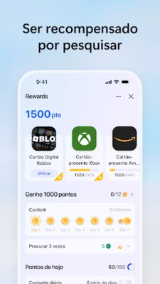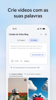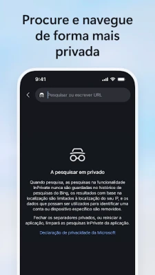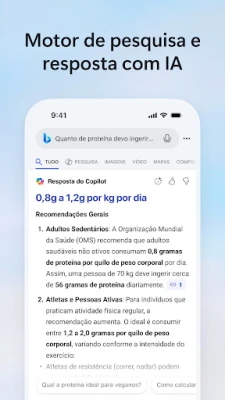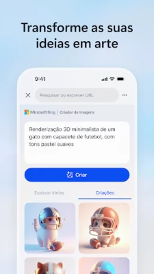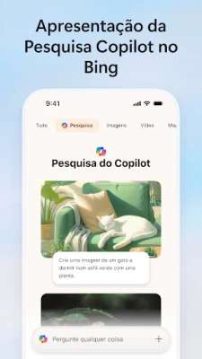 Para além de uma pesquisa inteligente, a Pesquisa Copilot no Bing é o seu parceiro versátil para a criatividade e organização. Dê vida às suas ideias com o Criador de Imagens, gerando visuais impressionantes a partir de texto. Use a sua câmera como uma poderosa ferramenta de Pesquisa Visual ou simplesmente fale para encontrar o que precisa com a Pesquisa por voz. Mantenha-se a par do que é importante com uma nova página inicial personalizável, verifique a Meteorologia e acumule recompensas com o Microsoft Rewards. Personalize a sua experiência com uma vasta galeria de Imagens de Fundo deslumbrantes, tornando cada interação visualmente cativante.
