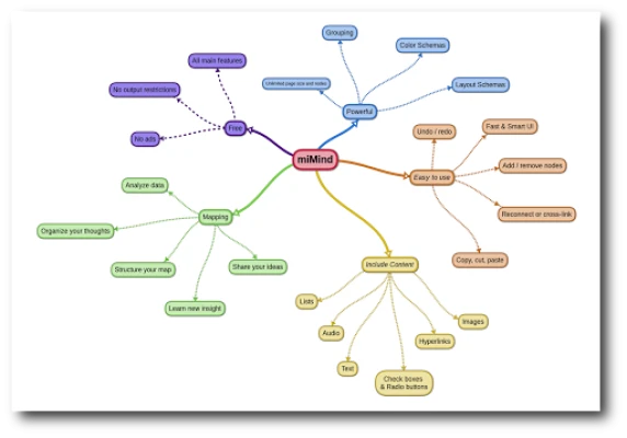 miMind é uma ferramenta poderosa para organizar seus pensamentos, criar esquemas e compartilhar ideias. Desenvolva desde listas simples até conceitos de engenharia complexos. Explore dezenas de layouts, cores, formas e padrões. Exporte seus mapas para imagens, PDFs, texto ou XML, facilitando a colaboração e a comunicação de suas ideias.