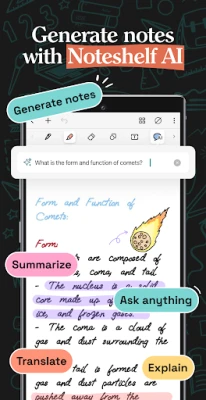 Com Noteshelf 3, a flexibilidade é a chave para a produtividade. Vá além da escrita: digite suas ideias com rica formatação, desenhe diagramas precisos transformando traços em formas impecáveis, ou incorpore gravações de áudio sincronizadas com suas anotações – perfeito para palestras e reuniões. A funcionalidade de reconhecimento de escrita manual eleva sua experiência, convertendo caligrafia em texto pesquisável em 65 idiomas. Dê um toque único a cada página com stickers envolventes e eleve o impacto visual de suas notas com imagens das bibliotecas Unsplash e Pixabay, editáveis com recursos avançados de recorte e remoção de fundo. Para um apoio extra, o Noteshelf AI simplifica a criação de notas, resumos, traduções e explicações complexas, liberando seu tempo para o essencial.